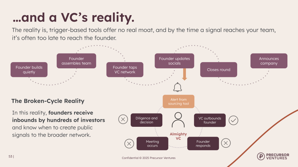 Over the past few years, I have noticed a substantial increase in the number of inbound messages the portfolio founders we work with receive. Some of the messages are very well written, while others feel more like generic, trigger-based outbound templates. The reason I wanted to talk about this at our AGM is that I’ve seen more and more people who have learned how these trigger-based early-detection systems work. They’ve become quite strategic about when they send out the subtle signals they know will result in more attention and inbound.