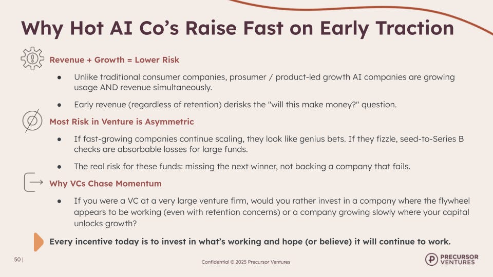 Right now, rapid AI-driven traction is what gets VCs’ attention. Founders have figured this out, so they are doing whatever they can to generate steep revenue ramps over short periods of time to get venture capitalists’ attention. In some cases, what is being counted as “revenue” wouldn’t meet the traditional tests that we used for SaaS companies. But we are in a moment where deeply investigating the quality of a revenue number might be at odds with winning an allocation in a hot deal.