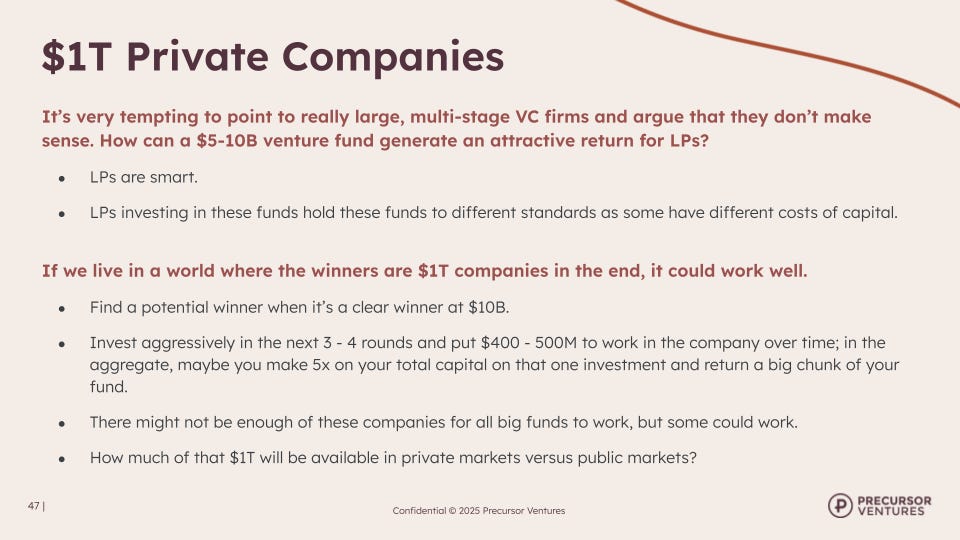 The LPs who made the strongest arguments for why these funds could work focused on rethinking the upper bound of terminal outcomes for VC-backed companies. We already have several private VC-backed companies valued at over $100B (including most of the Elonosphere companies, OpenAI, Stripe, Databricks, and Anthropic, to name a few). The math for a given large VC fund looks far less daunting if you believe we will see another step change increase in the upper bound of what’s achievable for private companies.